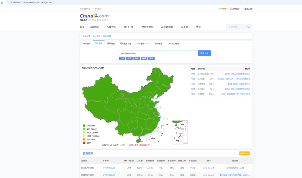 https://tool.chinaz.com/speedtest/wp.naisigo.com